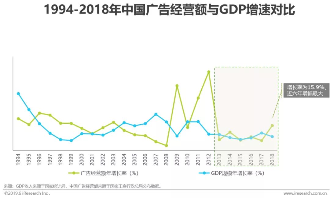 2018年中国广告经营额为7991.5亿元,较2017年增长15.9%,是近六年来增幅最大的一年,而GDP的增速相比较2017年有所降低。在众多行业中广告市场有他的特殊性存在: